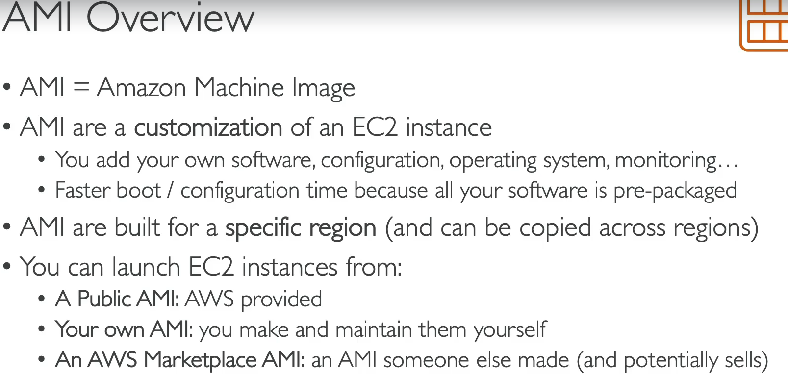 - Custom AMIs → Created by users (e.g., with your apps pre-installed).