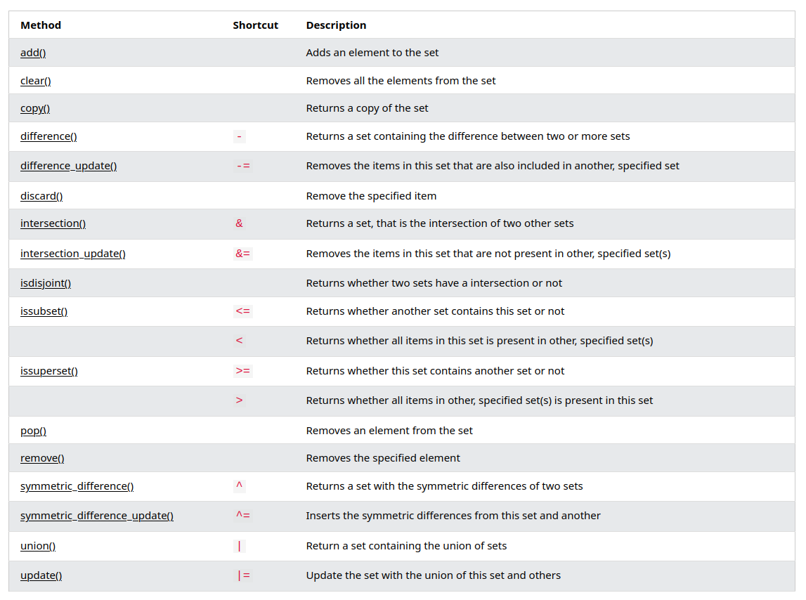 Set is one of 4 built-in data types in Python used to store collections of data, the other 3 are List, Tuple, and Dictionary, all with different qualities and usage.