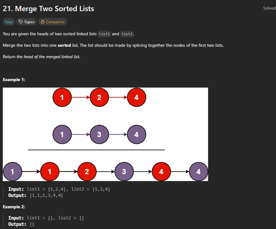 public ListNode mergeTwoLists(ListNode list1, ListNode list2) {